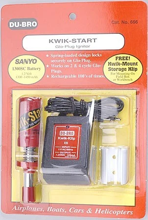 Kwik-Start securely mounts on glow plug for starting engines. Comes complete with Kwik-Mount Storage Klip and charger. Works with NORVEL Freedom XL and 7L glow plugs and all standard glow plugs.